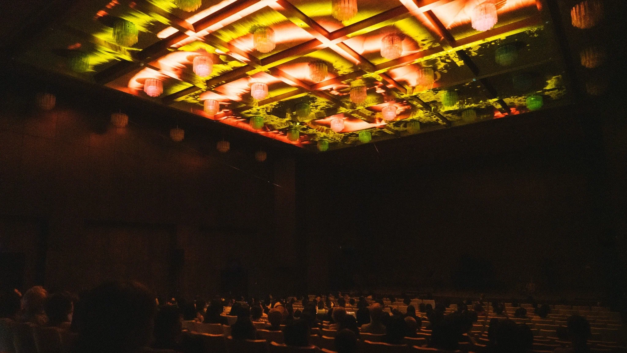 全曲的聲音採樣源自於三個人的樂器:中國笛、中阮、古箏,藉由電腦採樣與合成後,將整首樂曲讓32個散佈在演奏廳座椅上的震動喇叭,以及廳內6個環繞音響撥放演奏。震動喇叭將聲音能量傳導出去,共震接觸物件,操縱物件的共振與傳聲行為。因此,演奏廳的椅子被附著後,也轉化成一項發聲物件,宛如會發聲的樂器般。另外,設有震動喇叭的座位上方天花板,同時也會隨著喇叭的發聲行為產生互動影像,讓聽覺與視覺的空間感同步散落在演奏廳各方。整個表演是發生在觀眾席,表演元素有座位下的喇叭、天花板上的音像、與坐落於觀眾席的環繞音響,觀眾是在眾元素其中被包圍之狀態,而非傳統觀望舞台的狀態。